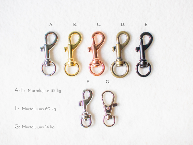 Koirien ja kissojen taluttimien lukoiksi valittavissa 35kg ja 60kg murtolujuiset lukot . Lukon koko 4-4,5cm ja paino 6 grammaa. Värivaihtoehdot ovat 35kg murtolujuudessa hopea, kultainen, ruusukulta, musta ja antiikkinen. 60kg murtolujuudessa värivaihtoehtona hopea.